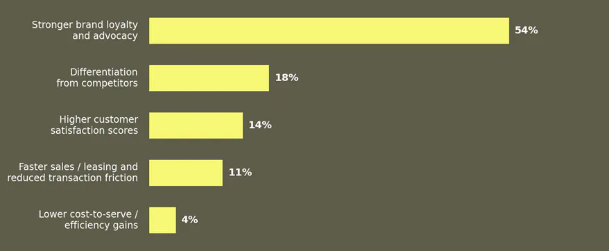 54% identified stronger brand loyalty and advocacy as the primary commercial return on CX investment - more than three times those citing differentiation from competitors (18%) or higher satisfaction scores (14%). The sector instinctively understands that the long-term return on CX is relational, not transactional.